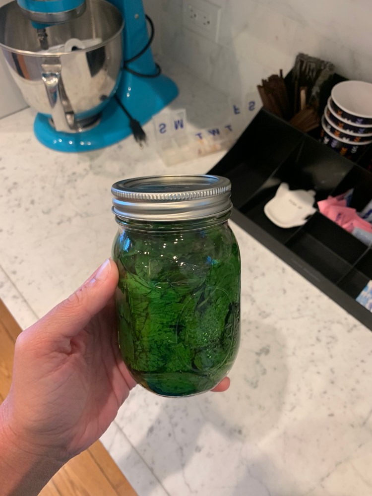 But ANYWAY, I cut a bunch of fresh mint, put it into a mason jar and covered it with vodka- easy and cute as hell.