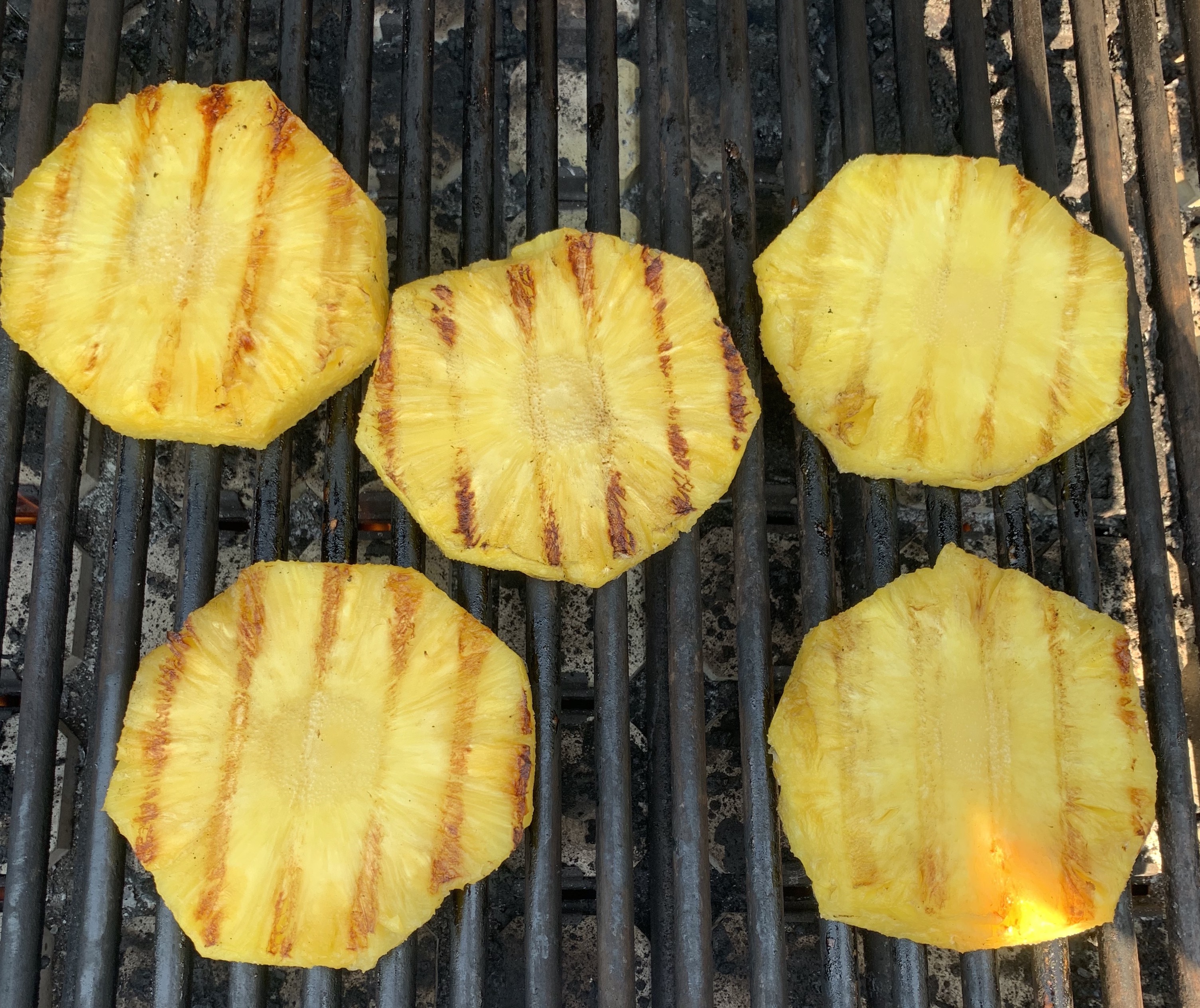 - Grill pineapple for 5-8 minutes per side, waiting till you get nice grill marks on the fruit.