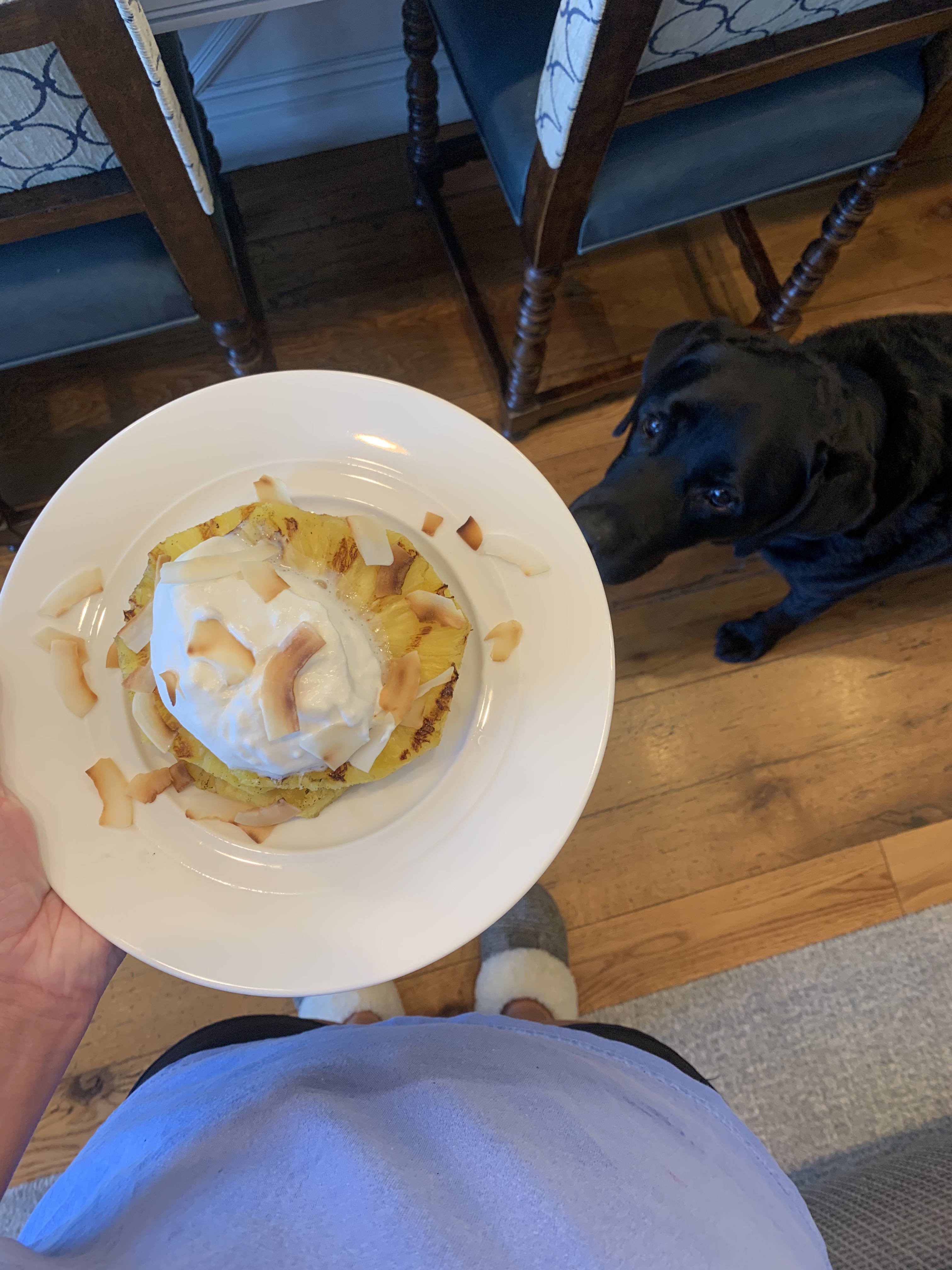 - Prep the pineapple- Cut off the outside skin (is it called a skin?) of the pineapple. Then slice into rings, about half an inch thick.