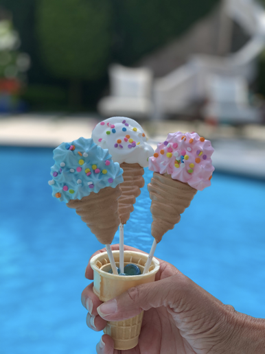 - I used a flat tip for the ice cream cones, just piping back and forth, tapering off to the end of the cone. For the blue and pink ice creams, I used a star tip and “dotted” out the shape of the ice cream scoop. For the white ones, I used a round tip, outlined the shape and filled it in. Top with sprinkles to make them extra adorable!