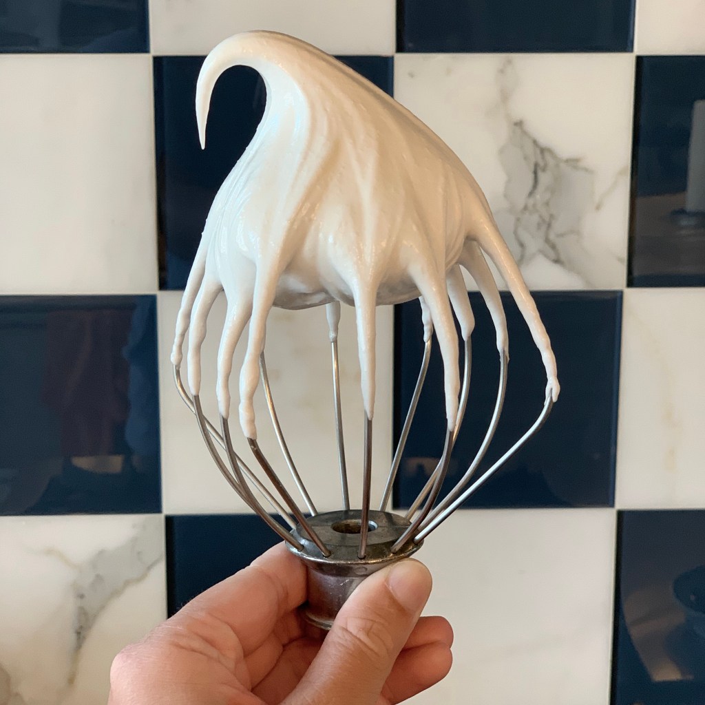 - Beat, continuing to add sugar, until the meringue is glossy and white and forms stiff peaks. To check, stop the mixer and detach the whisk, swirl it in the meringue, scoop up a dollop, and see how well it stays on the whisk. It it’s falling over, keep mixing. If it stays stiff, you’re ready to move on!