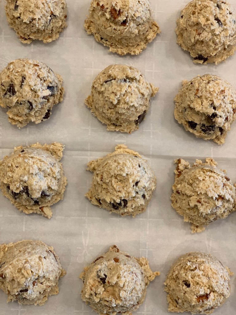 - Place scoops of dough 3 inches apart on cookie sheets lined with parchment paper and bake for 20-25 minutes, depending on how gooey you want your cookies 😉