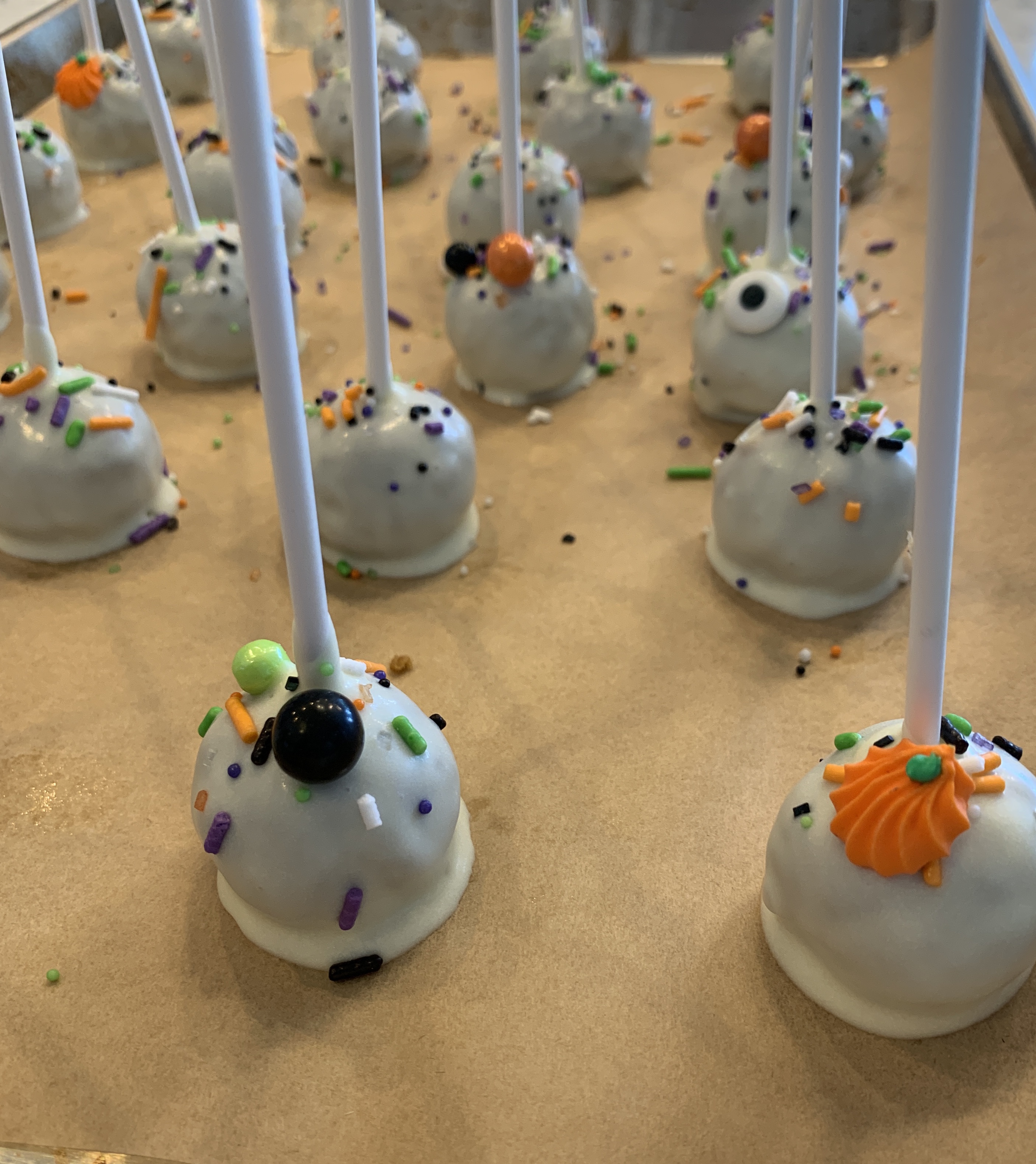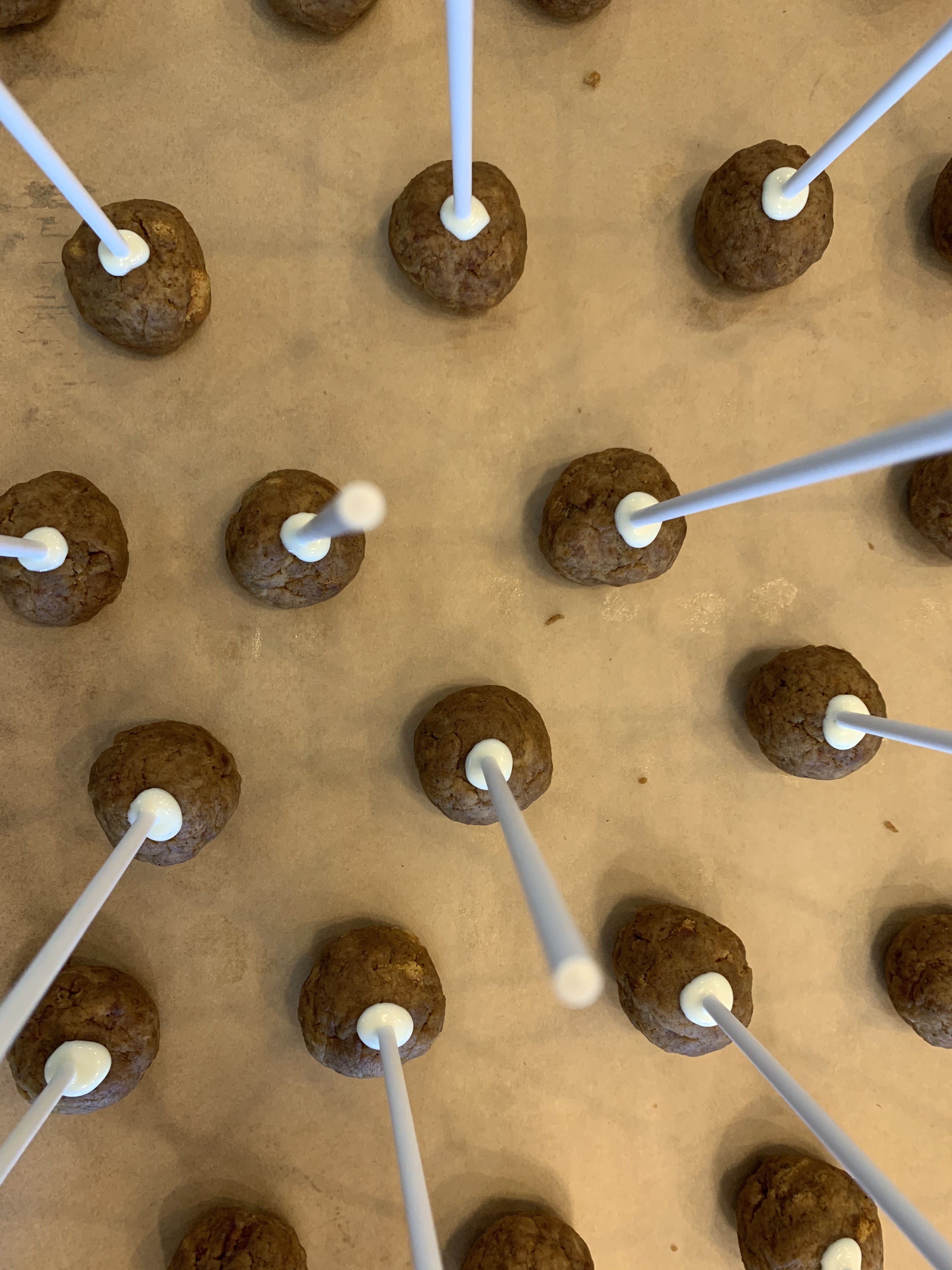 - Roll scoops of your crumb mixture into balls (~1 tbsp each) and place on a cookie sheet lined with parchment paper. Dip the tip of a paper lollipop stick into the melted chocolate, and stick into each “pop”. Place tray in the fridge for half an hour to allow chocolate to set and mixture to get firm.