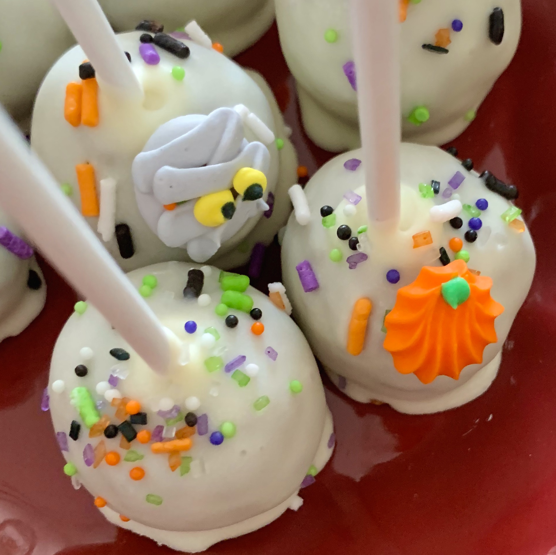 - Dip each pop into white chocolate, set back on your tray and sprinkle with sprinkles! Return tray of dipped pops to the fridge to allow chocolate to set.