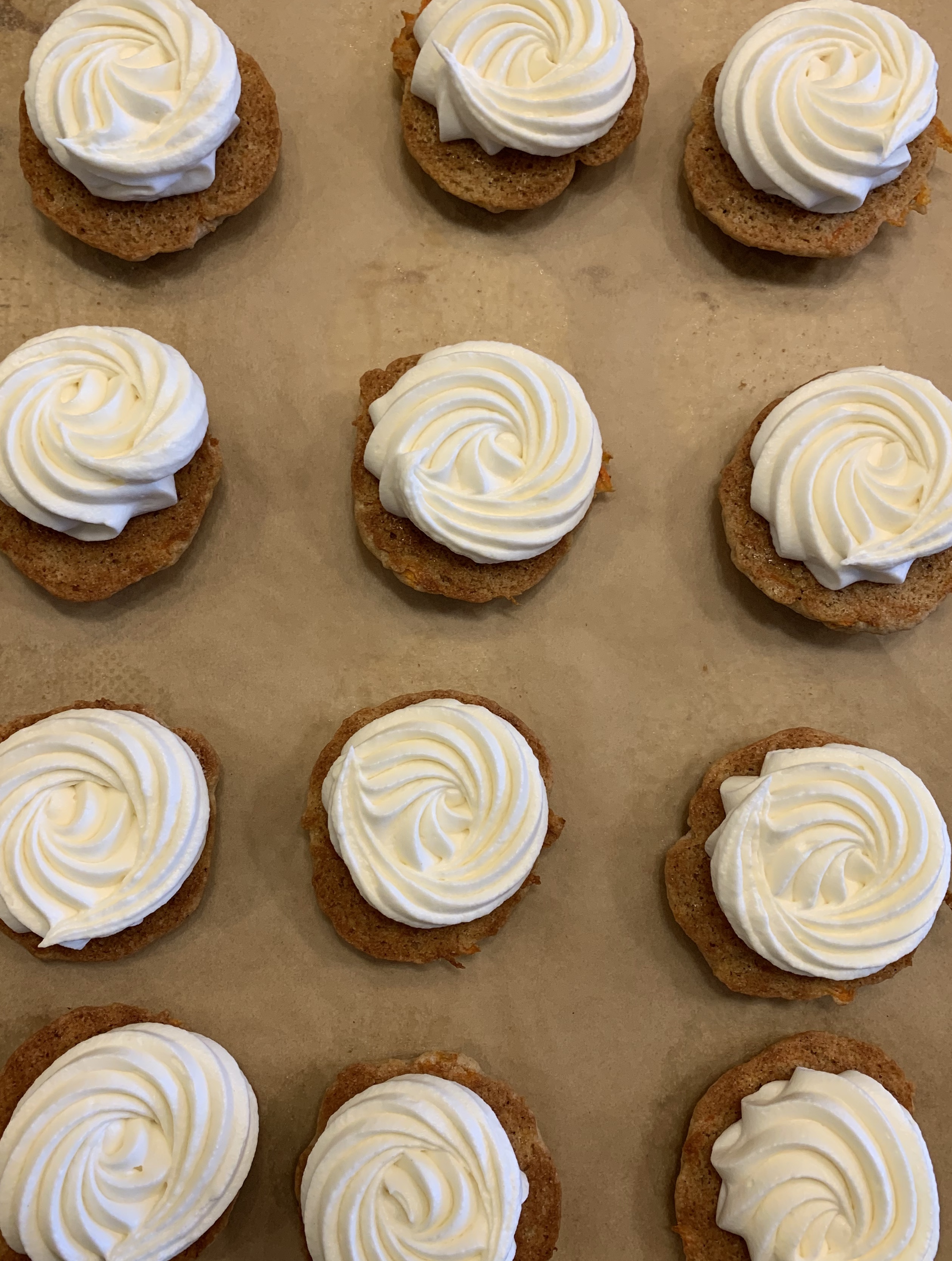 - When cookies are completely cool, turn them upside down and put filling onto half of them, then use the other half to make sandwiches. I like to use a piping bag to swirl the filling on, but they’ll be just as delicious of you spread it on with a spoon 🙂