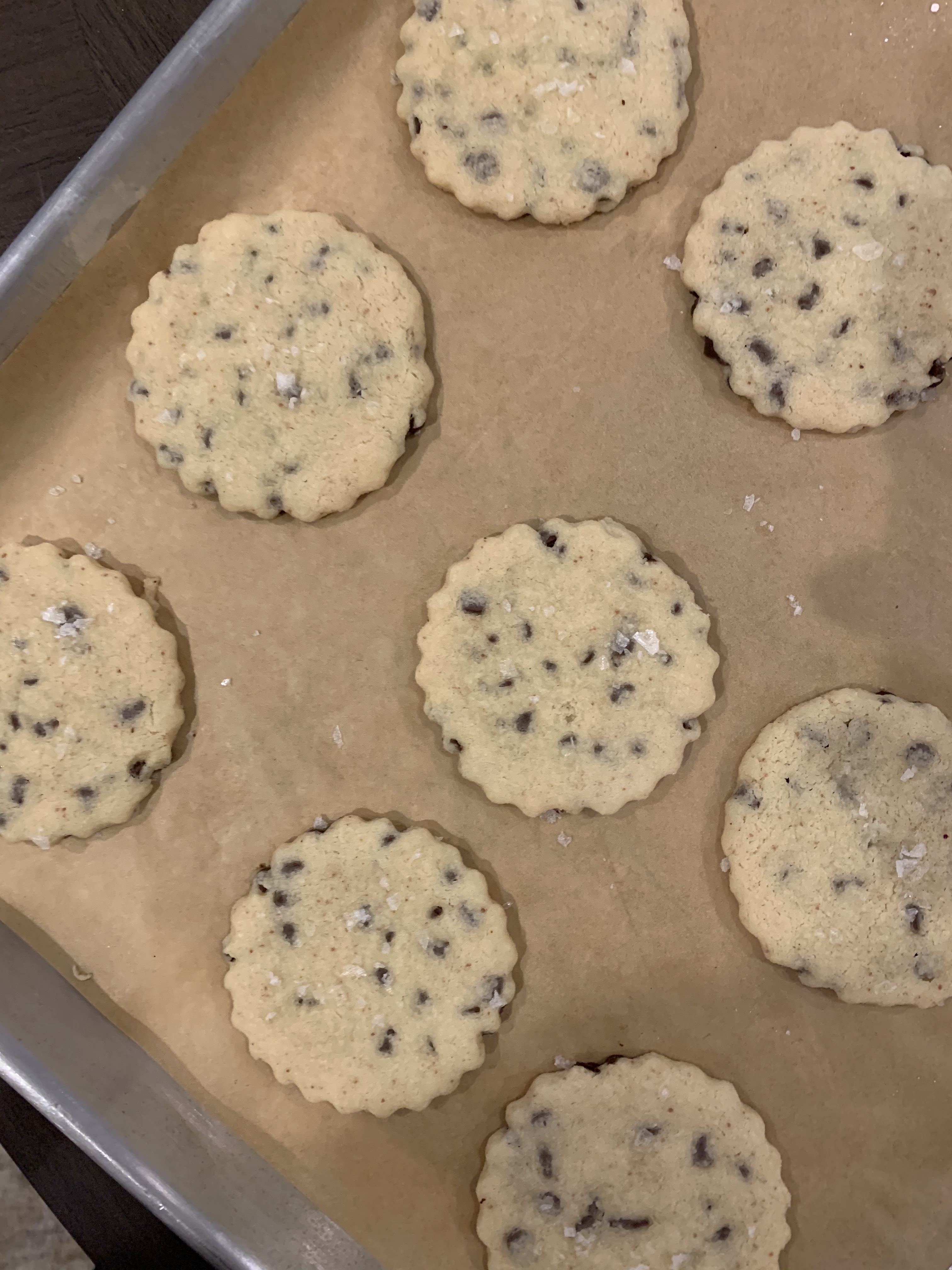 - On a floured surface, roll out the dough to ~¼ in thickness (the chocolate chips will keep you from rolling too thin) and cut out shapes with cookie cutter. Place cookies on a tray lined with parchment paper, about an inch apart. Sprinkle with flakey sea salt, if using.